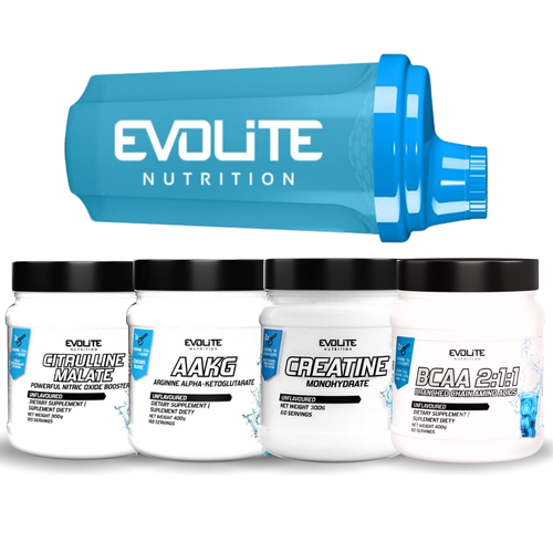 - Zestaw złożony z produktów: Evolite Citrulline Malate 300 g, Evolite Creatine Monohydrate 300 g, Evolite AAKG 400 g, Evolite BCAA 2:1:1 400 g i Evolite Shaker 700 ml.