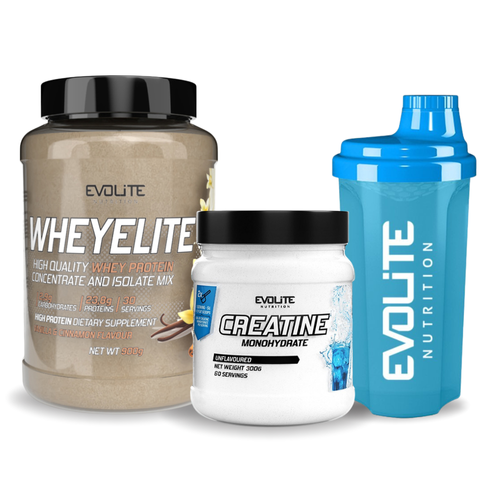 - Zestaw złożony z produktów: Evolite WheyElite 900 g, Evolite Creatine Monohydrate 300 g i Evolite Shaker 700 ml.
