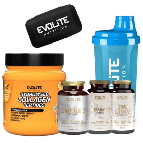 - Zestaw złożony z produktów: Evolite Hydrolizowane Peptydy Kolagenowe 300 g, Evolite Omega 3 100 softgels, Evolite Nutrition Zinc Citrate 100 Vcaps, Evolite Vitamin D3 2000IU 120 softgels, Evolite Shaker 700 ml, Evolite Pill Box Black.